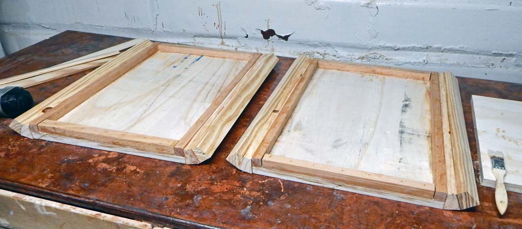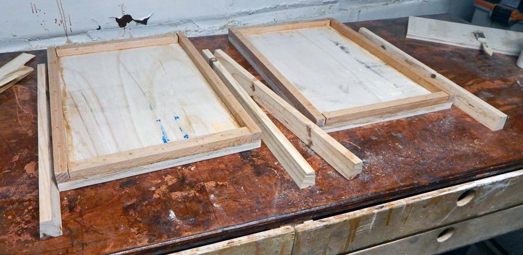 The cabs were built out of 3/4 inch plywood with 3/4 inch oak edge stiffeners. I had a good bit of scrap 3/4 inch oak sticks and some poplar and pine. I used most of the oak scrap on edges and used scrap pine and poplar sticks for internal bracing after the oak got used up. Both cabs required about 3/4 of a sheet of plywood total-- About 3/8 of a plywood sheet per cabinet. Plus the scrap 3/4" sticks, and most of an 8 foot long 2 X 12 inch pine board for making the radiused corners.
