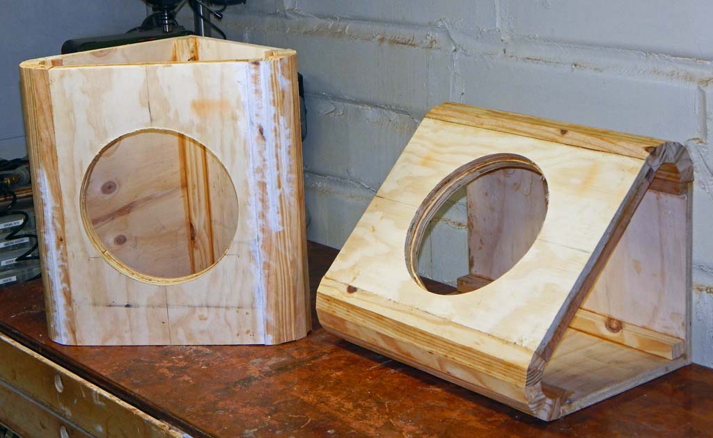 Triangular cabs seemed about as big as would fit the space. Cabs with internal volume big enough to be friendly to a 12” speaker. A 15 inch wide X 22 inch tall flat face. About 3.25 inch radiused curves-- 135 degree sweeps connecting the front baffle board to the two back sides of the triangular shape. The radiused curves smoothly tangent to both the front baffle board and the sides. Each radiused front-to-side corner has a smooth curve of about 8 linear inches. Perhaps the total unobstructed horizontal baffle-board width could “acoustically” be considered to be 15 inches of the flat front plus 16 inches of smooth curve, for an effective baffle board width of 31 inches? I'm too ignorant about speakers to know whether that is a proper way to think about it.
