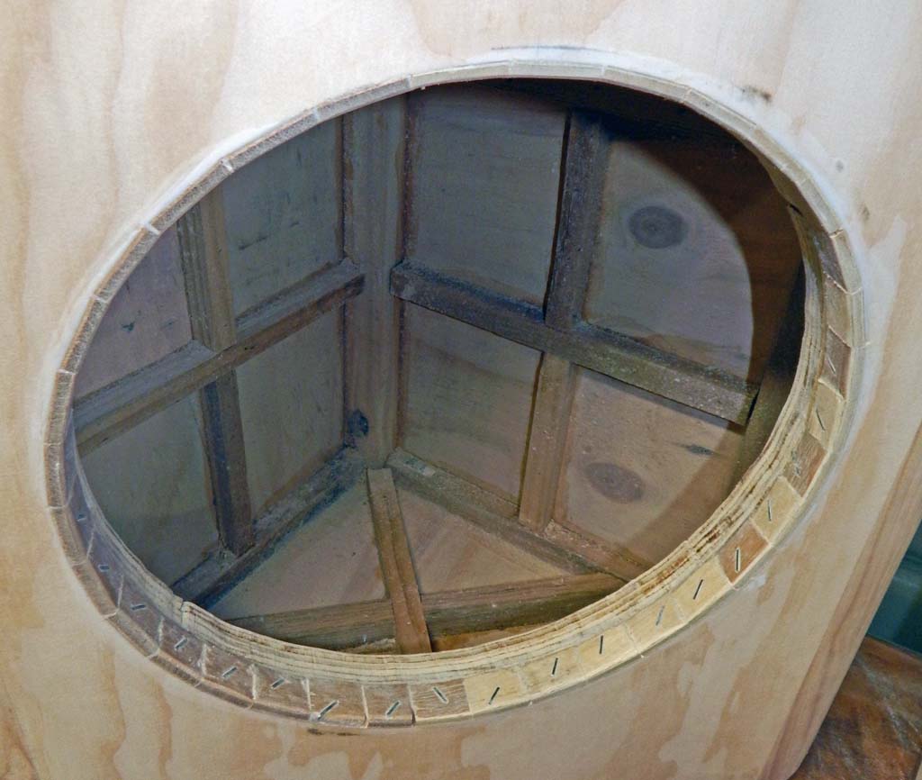 Internal detail photos which also show another carpentry error. I have a big router but never bought or built a good-quality circle cutting jig because I rarely need to route circles. On the earlier subwoofer cab and these coax cabs, I used a small rotozip router because a flimsy rotozip circle jig is the only one I had.