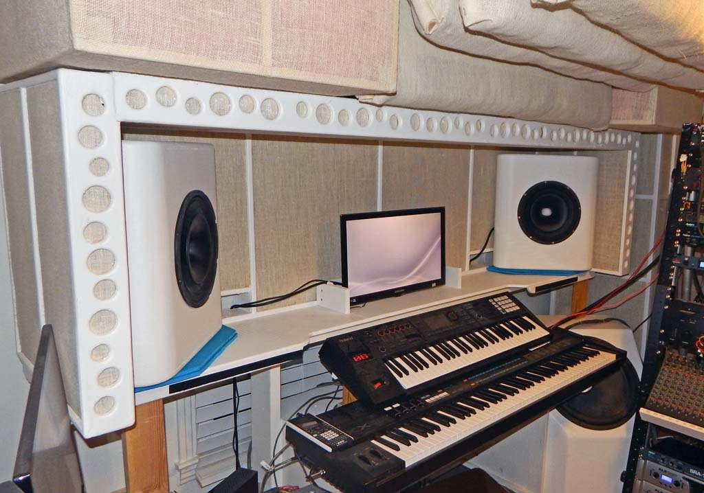 Pictured is the previous setup with the old JBL 8" 2-ways "soft soffited" or whatever you want to call it-- Surrounded by foam and polyester batts, at a 45 degree toe-in. The entire “inside” of the corners surrounding the speakers are filled with medium-density open cell foam. I had a local foam company make them to fill the entire corner surrounding the jbl speakers. The foam devices behind the polyester batts look similar to the Stonehenge stage props from the Spinal Tap movie.