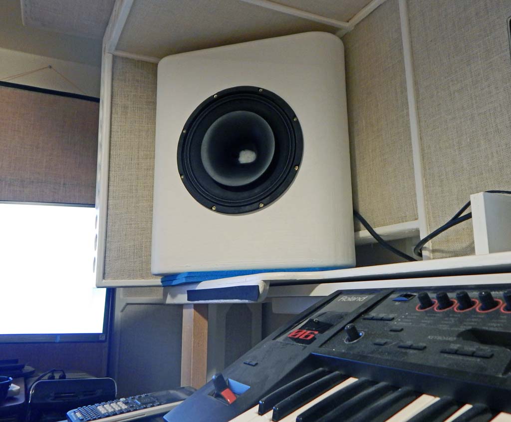 In this picture I was experimenting with small low-density balls of polyester stuffing placed in the horn throats to discover if that would “reduce horn diffraction” or change the frequency response or the sound.