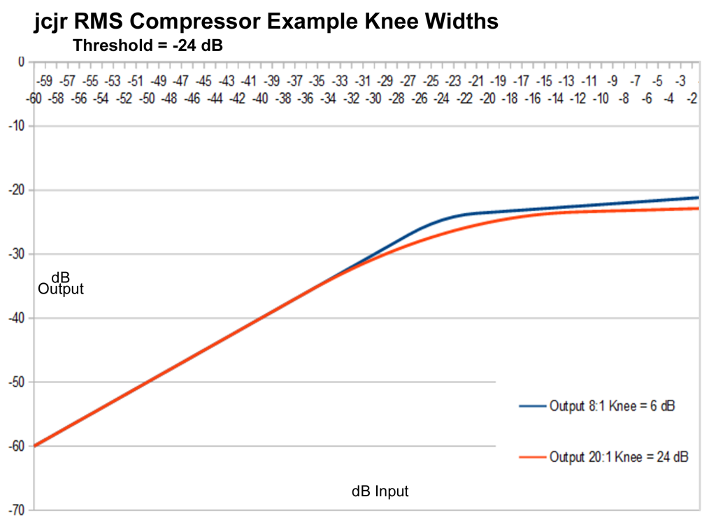 A 24 dB Knee Width would gradually begin compression at [Threshold minus 12 dB] and finally reach the full compression ratio at [Threshold plus 12 dB].