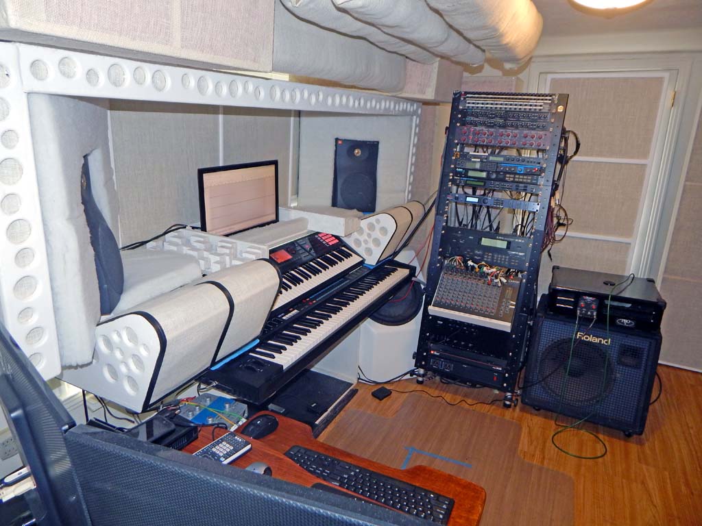 The acoustic treatment comprises about 25 home-made absorbers of various size, shape and function. The room is 15 feet wide, 11.5 feet front-to-back, with 6.7 foot ceiling height.