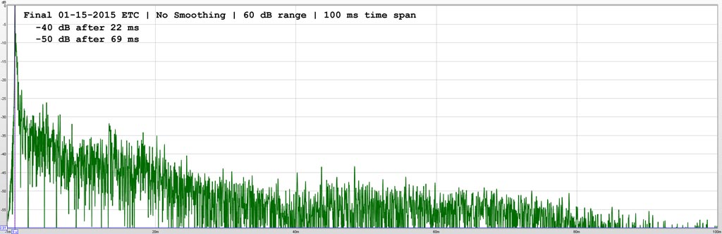 I am ignorant about interpretation of ETC graphs, but here are 20 ms and 100 ms ETC graphs for whatever utility they may provide to interested experts. As best I can tell, it shows a fairly low level of early reflections, and no “haas kicker” late reflections, but I prefer a non-reflective “dead” listening space.