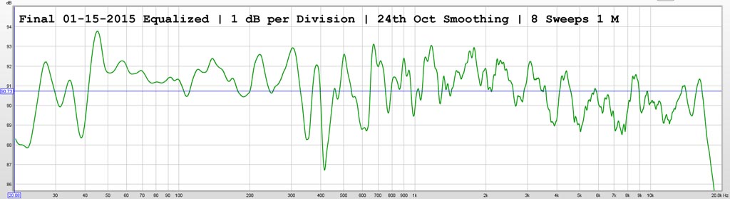 Here is the room response at listening position, measured via the excellent Room EQ Wizard program. Conservatively equalized with the Parametric EQ and Auto-EQ features of a DBX Driverack.